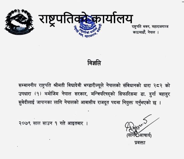 Kathmandu, July 18. Dr Durga Bahadur Subedi has been appointed as Nepali Ambassador to the Japan by President Bidya Devi Bhandari.