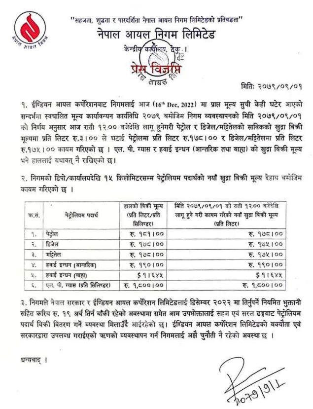 The corporation instructed the pumps in Kathmandu valley to sell petrol at a new price of Rs 178 per liter. Similarly, Diesel and Kerosene will be sold at Rs 175 per liter.