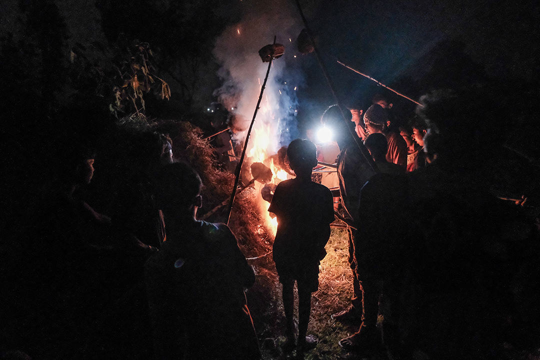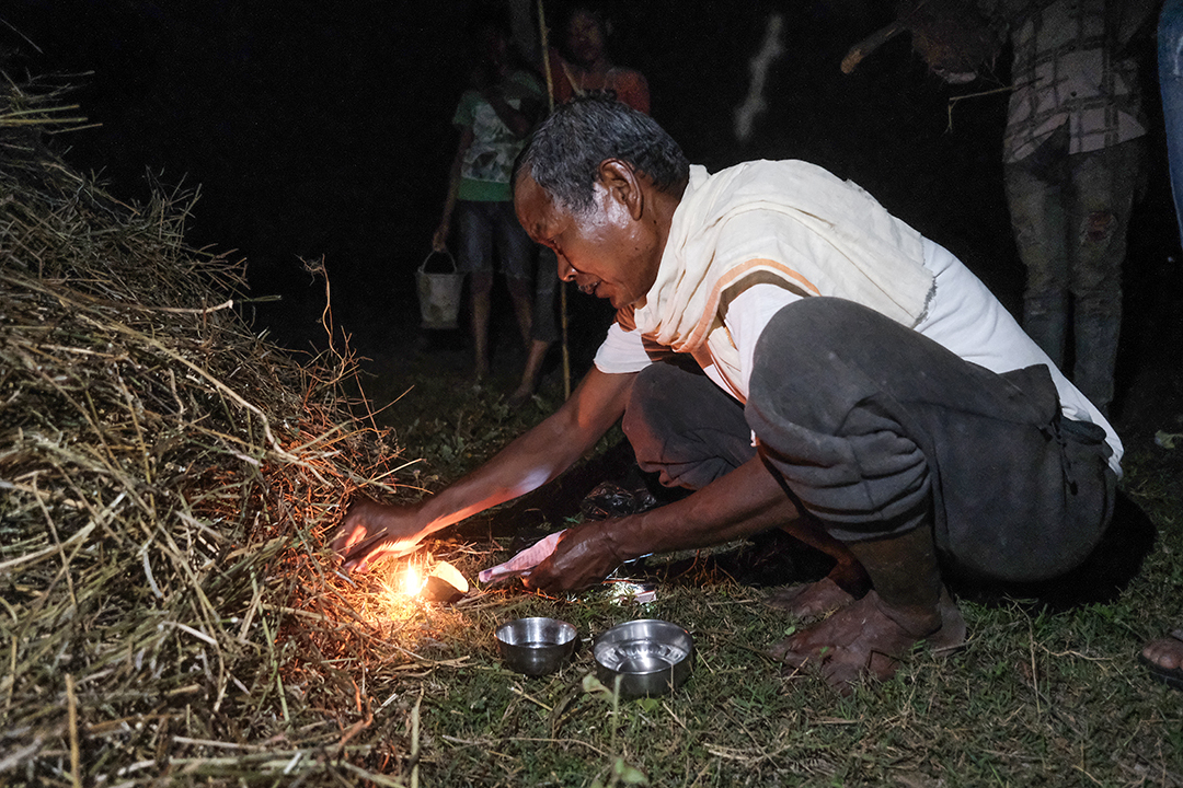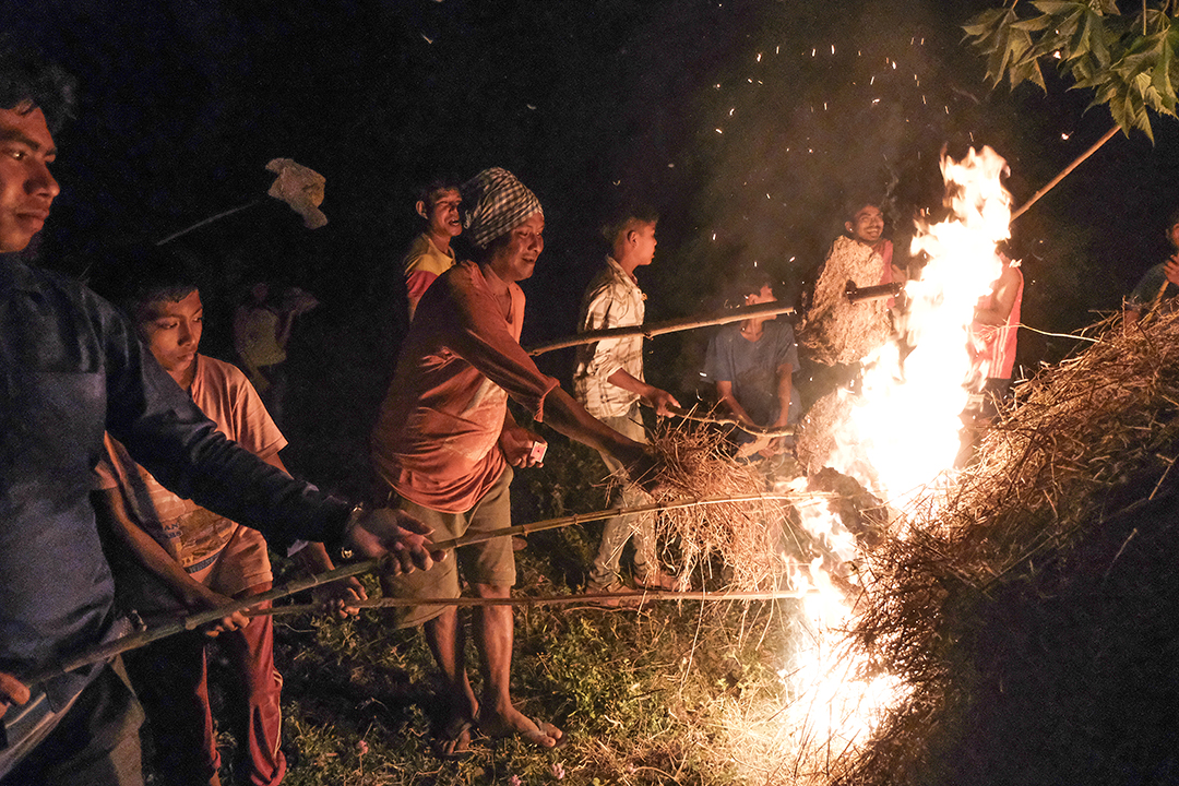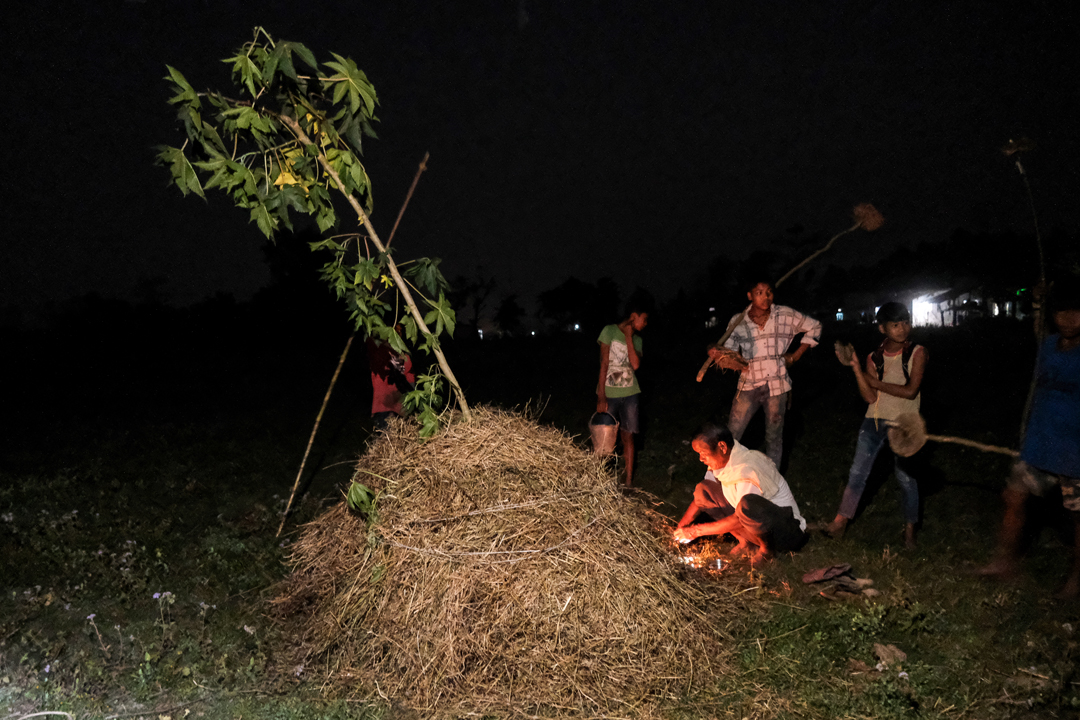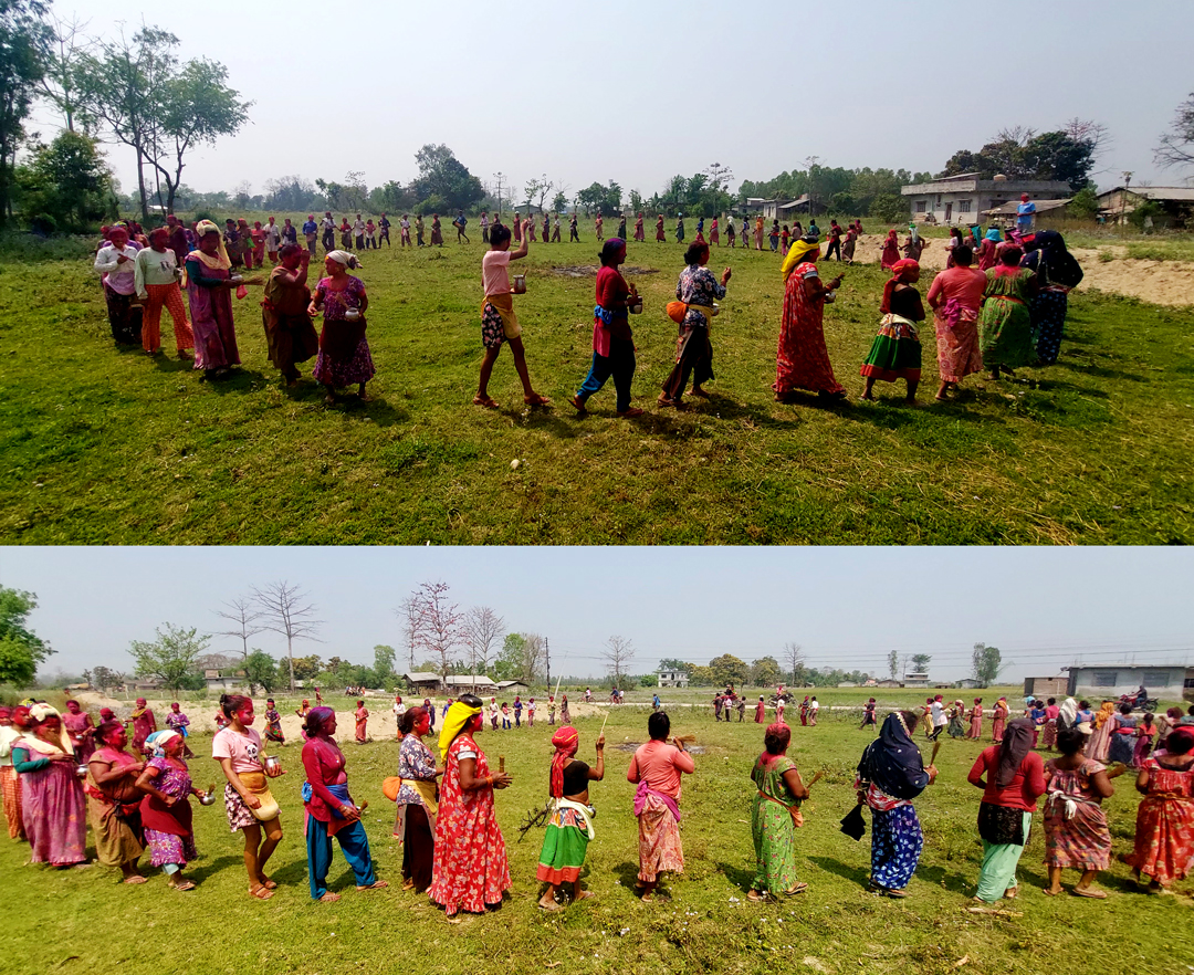 Every year, on the evening of the full moon day of the Nepali month of Falgun (or, Fagu Purnima), the male members of Rajapur’s Daulatpur Tharu village gather in a nearby field. They put up a big hay pile on the ground and wait for the sunset. After the sky completely darkens, the Guruwa (or Tharu priest) performs a worshiping ritual.