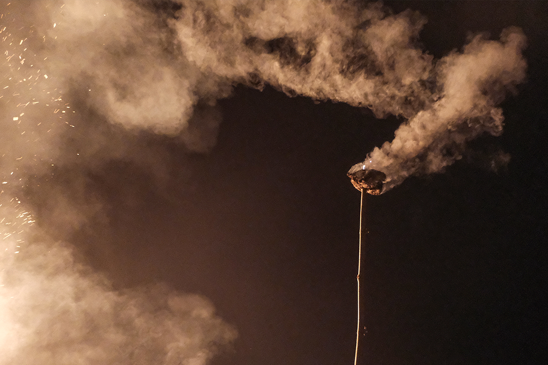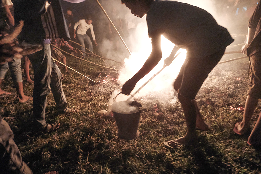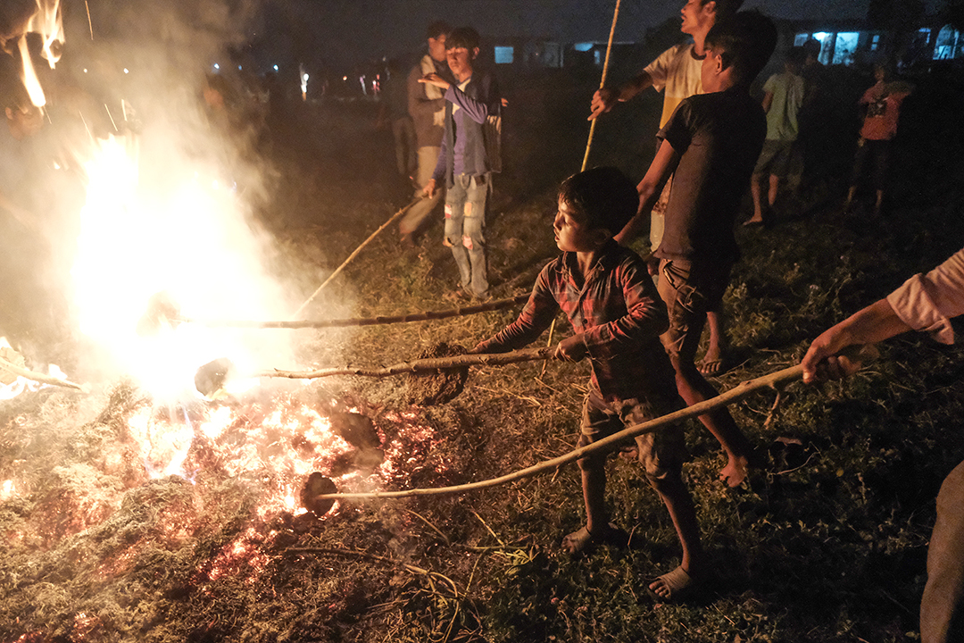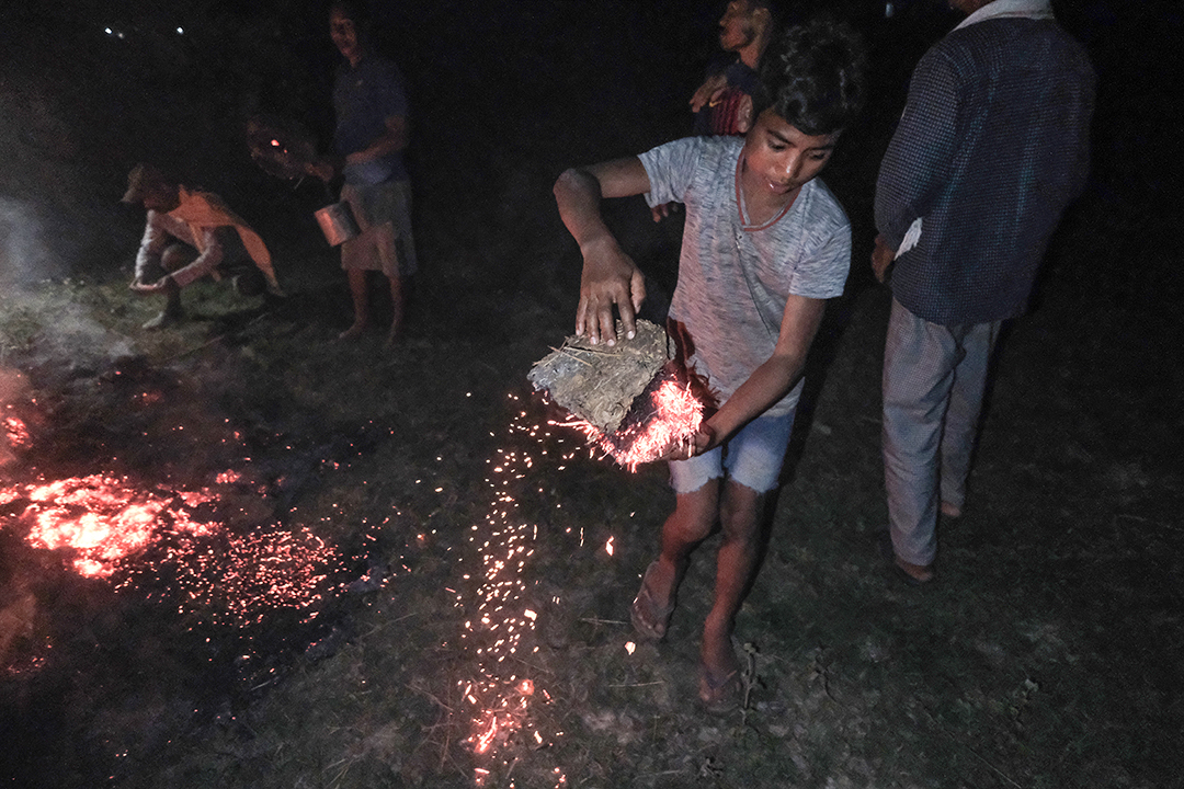 As the Guruwa set fire to the hay pile, young boys from every house arrive in the field carrying cow dung cakes. Some boys carry the dung cakes in metal buckets, while others hold them with a long wooden stick. The boys light the dung cakes on the burning hay pile. They then carry the new fire to their homes.
