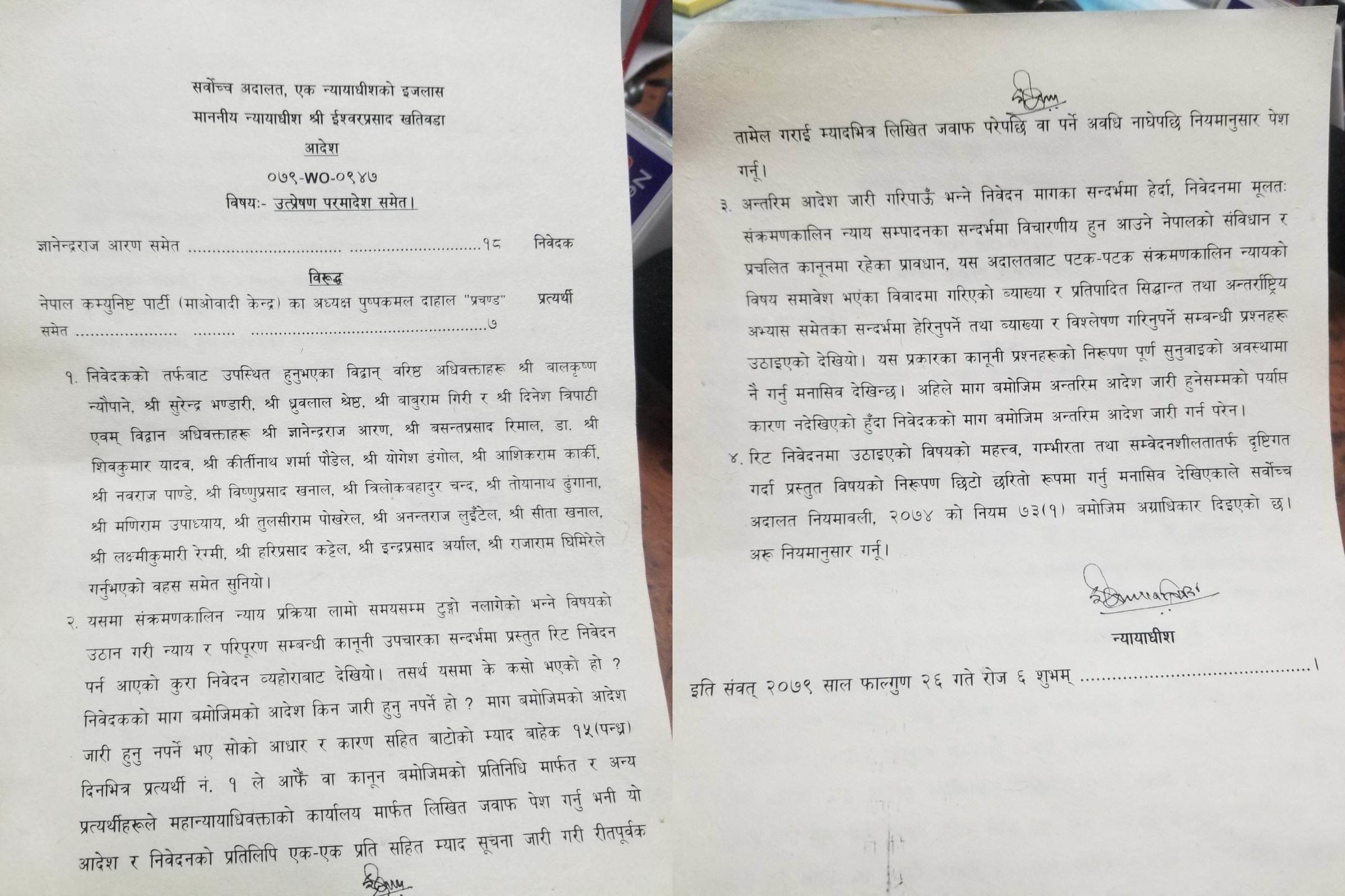 Kathmandu, March 10. The Supreme Court has issued a new order in the writ case against Prime Minister Pushpa Kamal Dahal Prachanda. The order instructs Prachanda to show cause to the case.