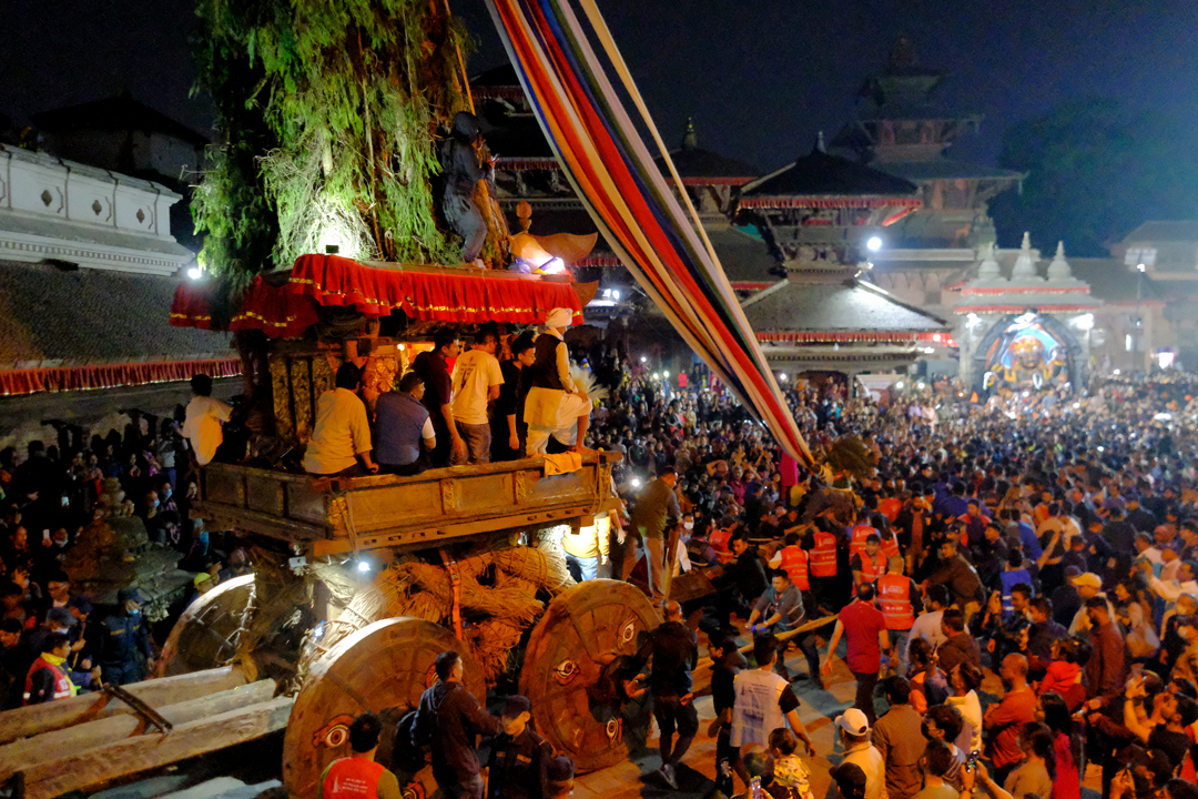 The chariot itself is a ten-story structure, with each story representing the abode of different gods. It is supported by four huge wheels, each representing a separate icon of Bhairav, the lord of hostility. The parade is led by special Bajracharya priests, who are responsible for regularly worshiping and maintaining the deity and the temple.