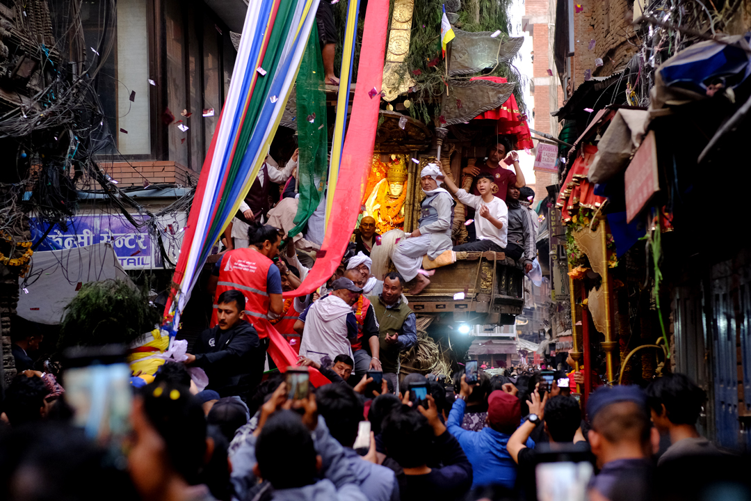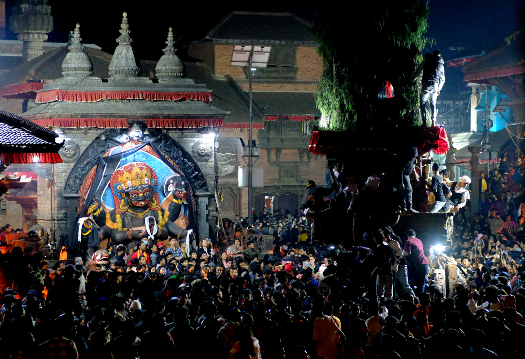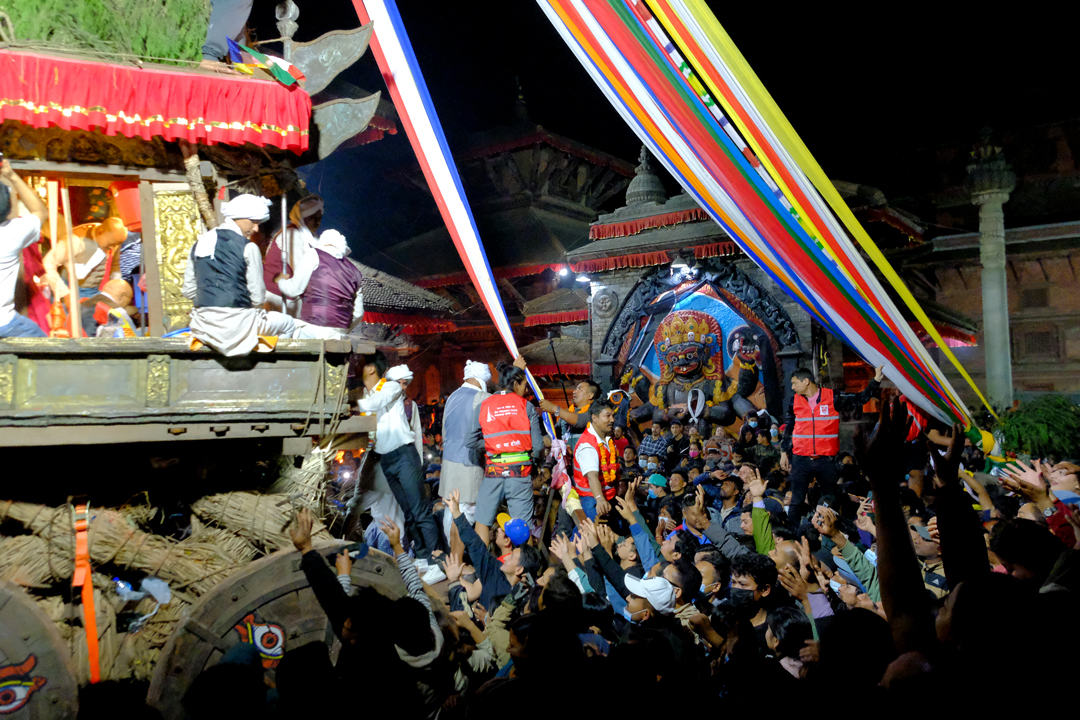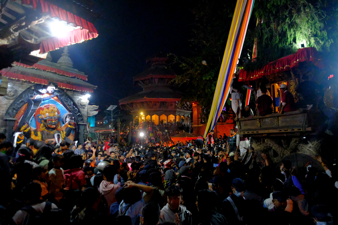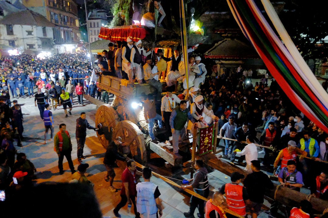 On the second day of the Jatra, the chariot was pulled from Ason Chowk to Balkumari, Kel Tole, Indra Chowk, and Maakhan. It finally rested in front of the Kal Bhairav deity in Hanuman Dhoka of Kathmandu Durbar Square. Traditional musical bands accompanied the procession, as devotees gathered along the route to pay their respects and make offerings to the “Janbaha Dyo” deity residing in the chariot.