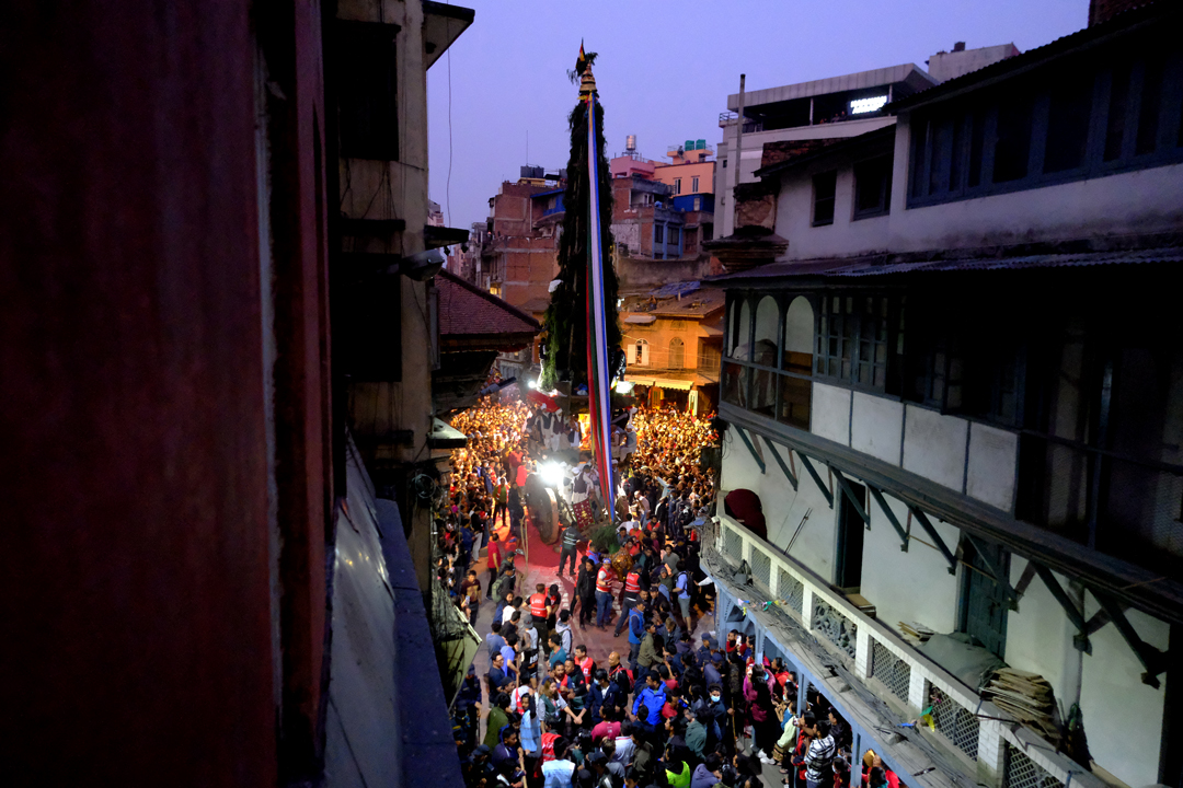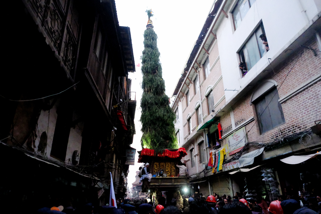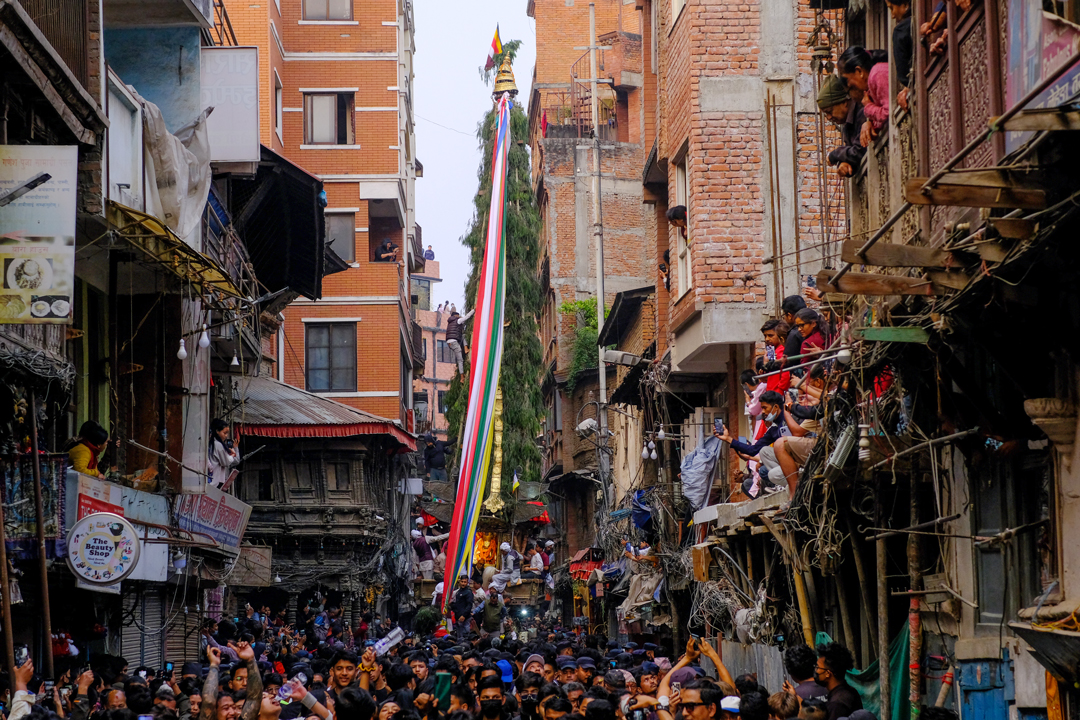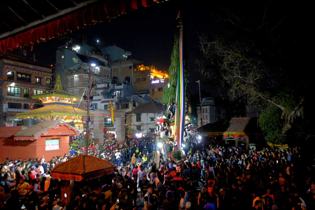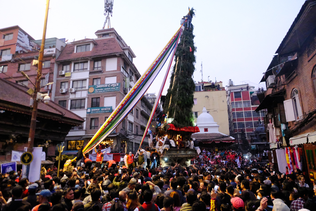 On the second day of the Jatra, the chariot was pulled from Ason Chowk to Balkumari, Kel Tole, Indra Chowk, and Maakhan. It finally rested in front of the Kal Bhairav deity in Hanuman Dhoka of Kathmandu Durbar Square. Traditional musical bands accompanied the procession, as devotees gathered along the route to pay their respects and make offerings to the “Janbaha Dyo” deity residing in the chariot.