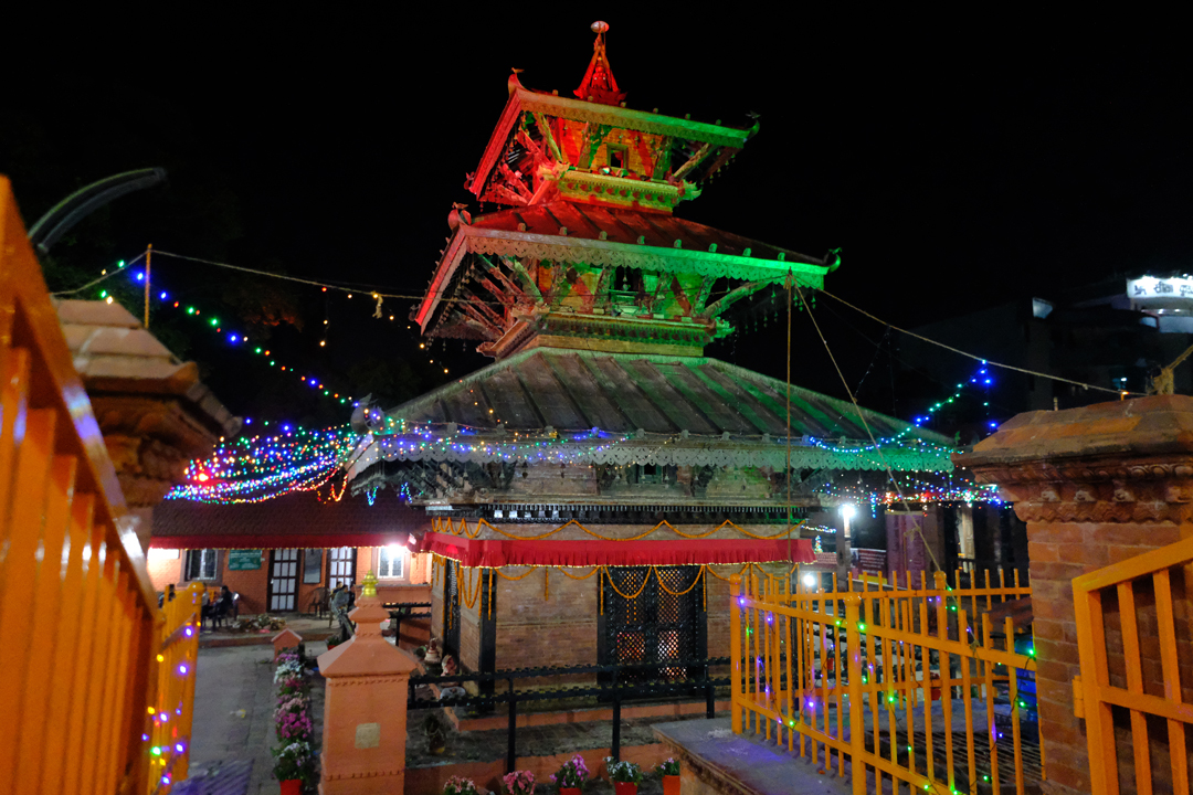 The temple of Tudal Devi shines in the festive lights on the eve of Gahana Khojne Jatra.