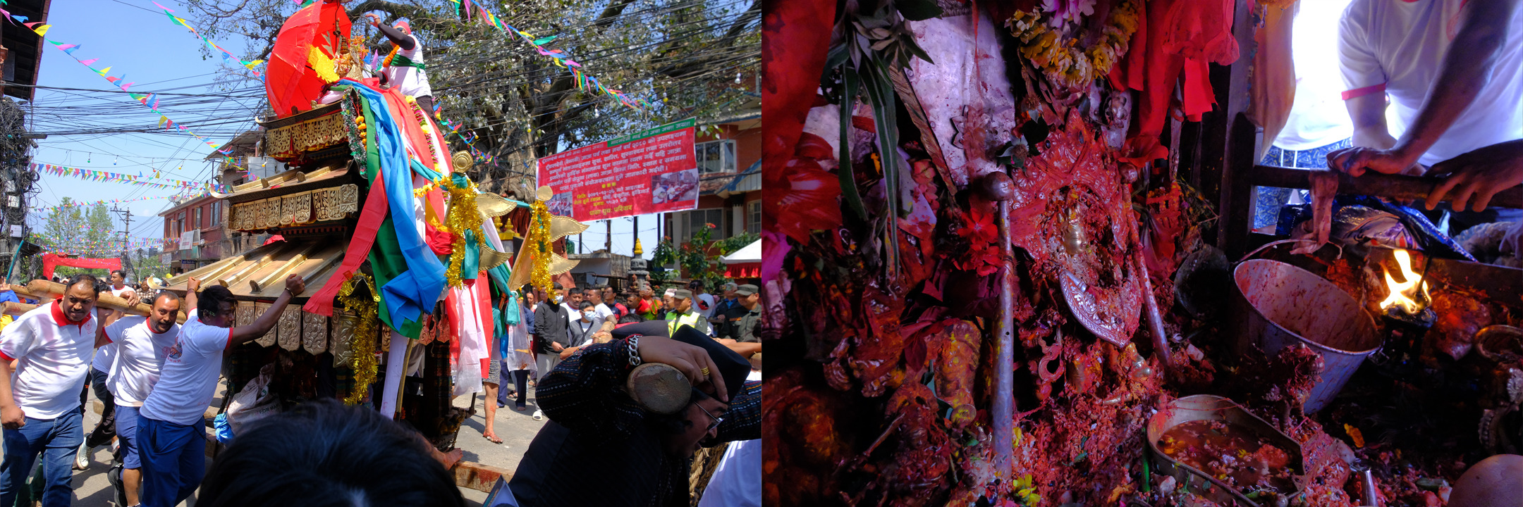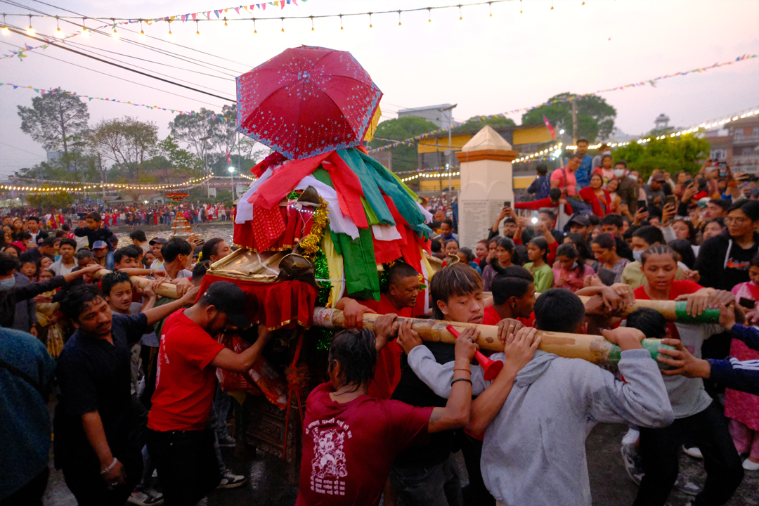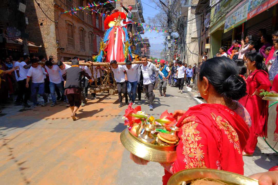 During the primary day of the Jatra, the idol of Tudal Devi is placed on a palanquin and carried on shoulders through the town of Hadigaun. The palanquin is stopped several times at the doorstep of houses marked with red mud.