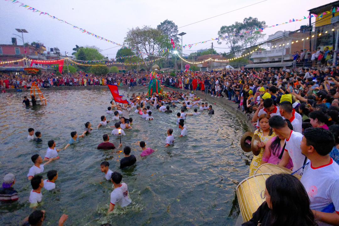 Kathmandu, April 7. The ancient town of Hadigaun in Kathmandu is known for its unique and vibrant forms of festivals, one of which is the famous “Gahana Khojne Jatra” celebrated in the Gahana Pokhari pond. During this festival, devotees carry a palanquin of Tudal Devi on their shoulders and enter the pond, symbolizing the search for her lost jewel.