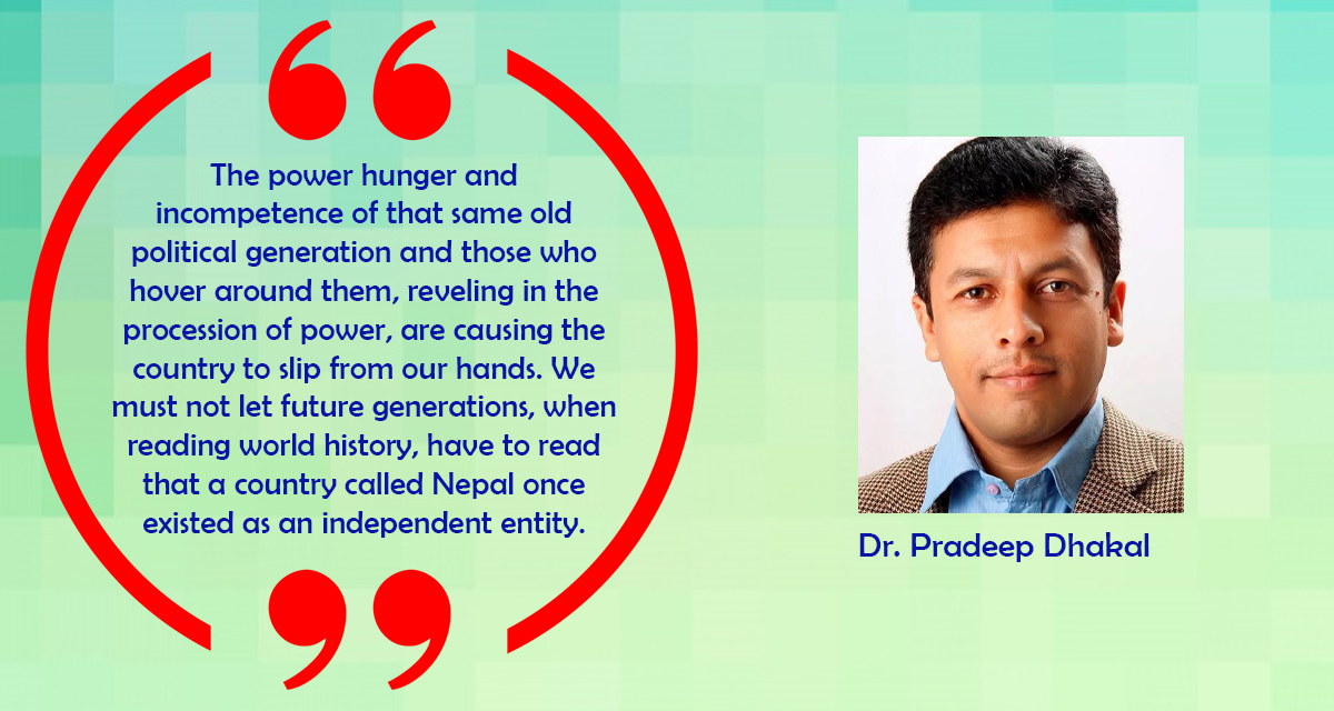 The power hunger and incompetence of that same old political generation and those who hover around them, reveling in the procession of power, are causing the country to slip from our hands. We must not let future generations, when reading world history, have to read that a country called Nepal once existed as an independent entity. There is still time. It is beneficial to move forward by compromising with the new generation. Let’s come to our senses and take a wise step forward.